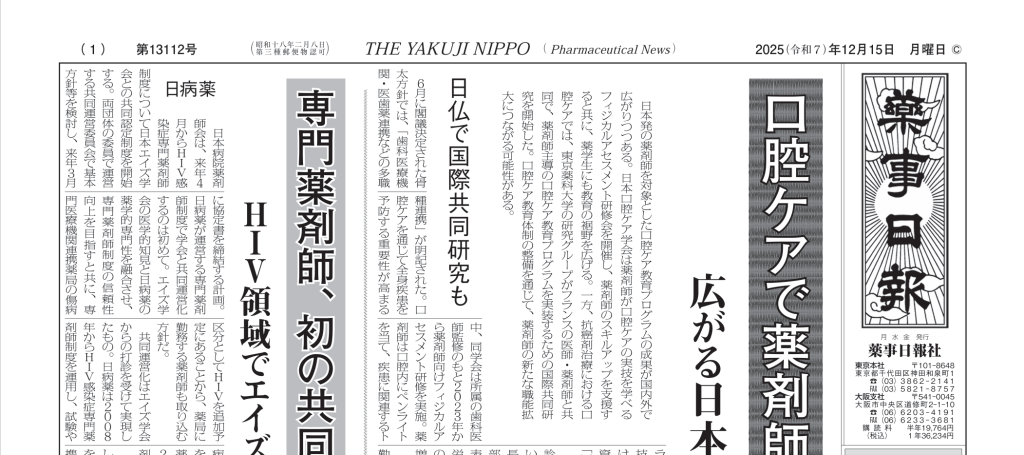 2025年12月15日付の『薬事日報』にて、山浦教授の口腔ケア学会薬剤師部会に関する記事が掲載されました。